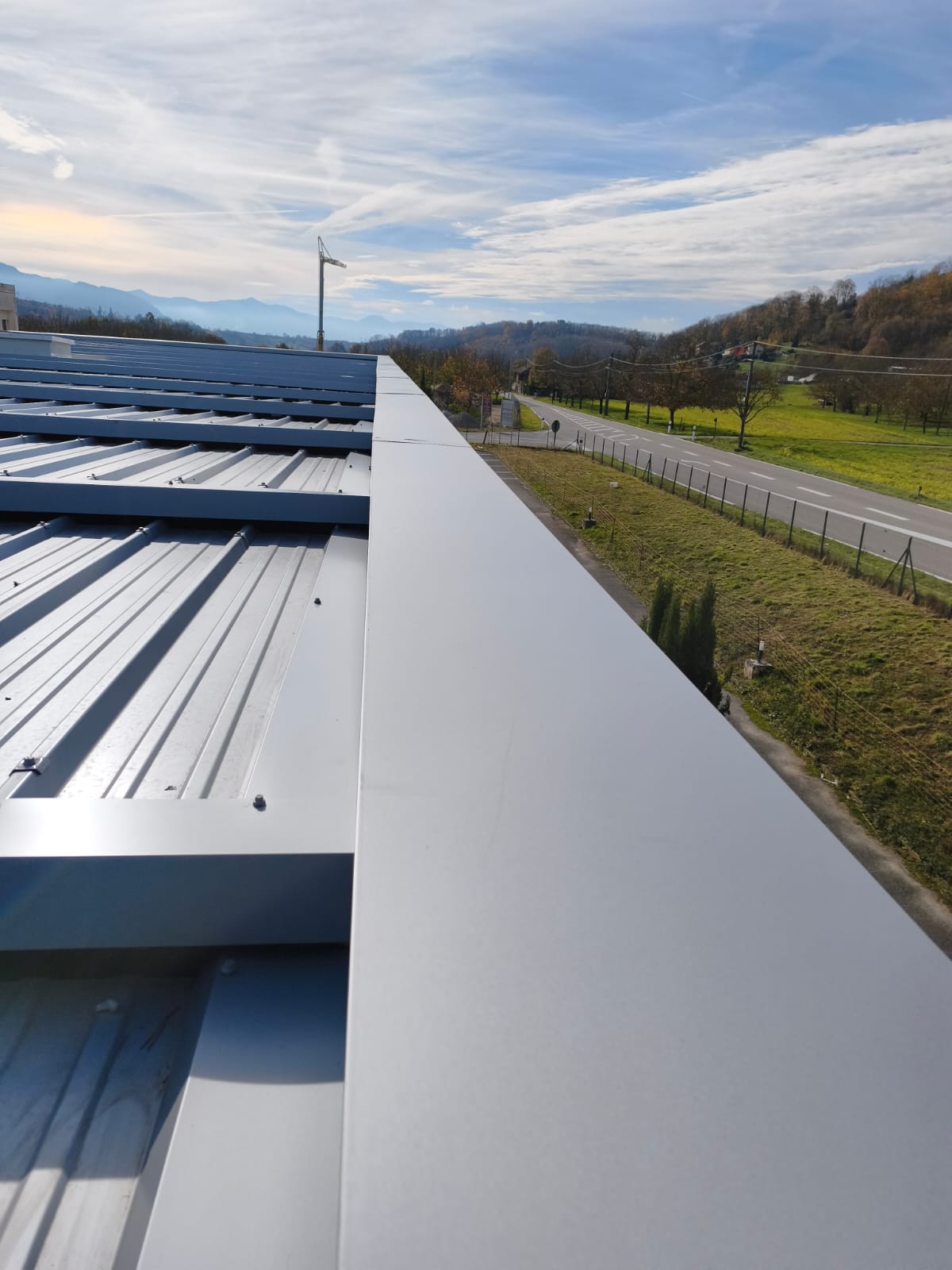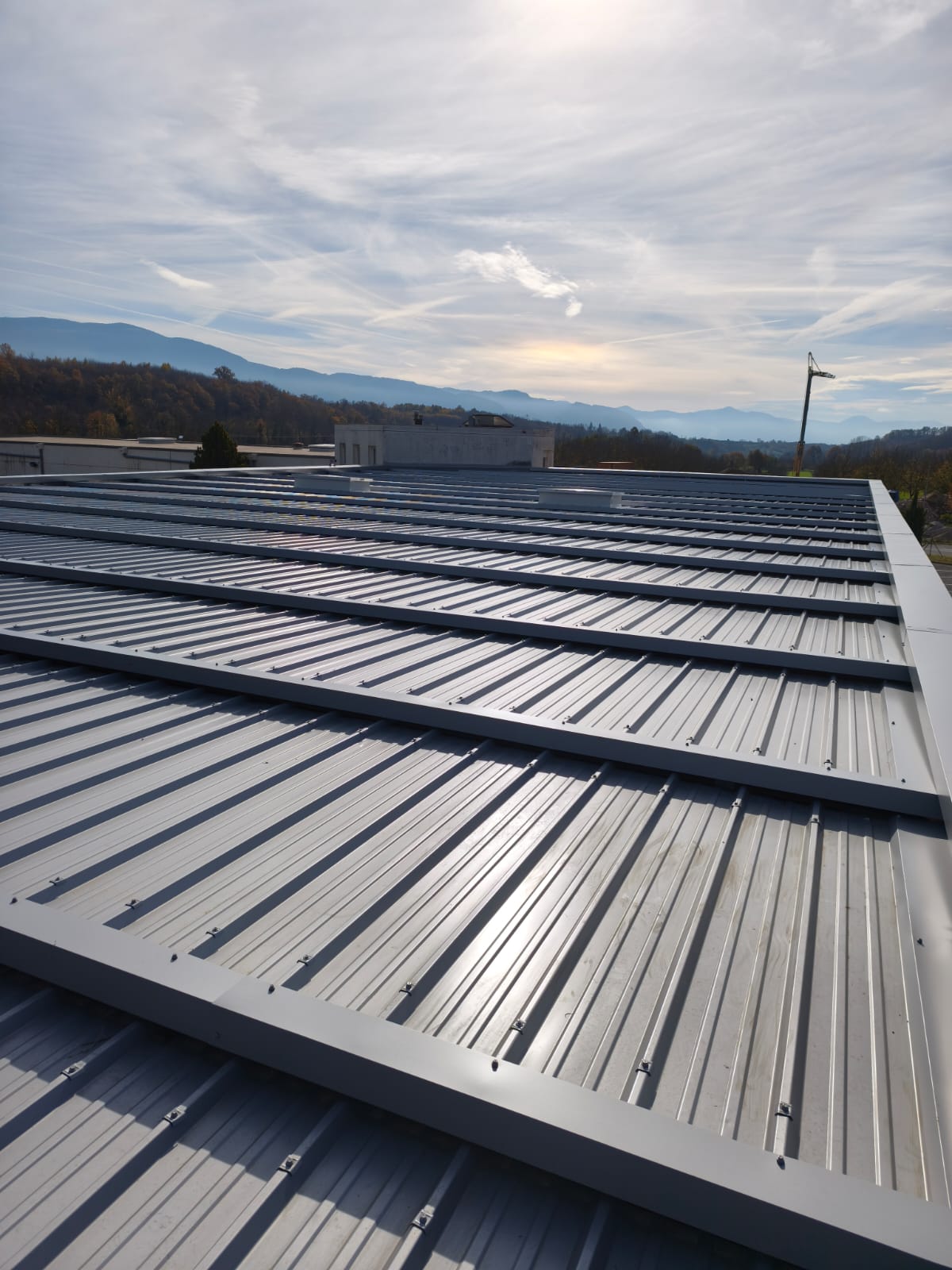 Cette intervention a également inclus la pose d’un exutoire de désenfumage avec asservissement, ainsi que la mise en œuvre des accessoires de couverture et couvertines, afin de garantir une toiture parfaitement étanche, sécurisée et conforme aux normes en vigueur.
