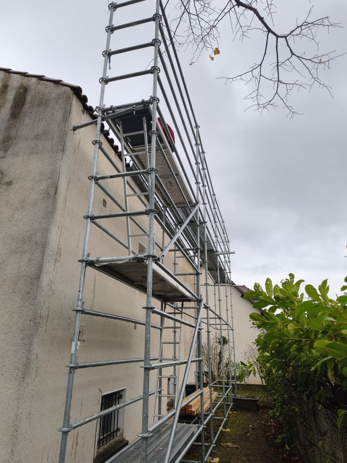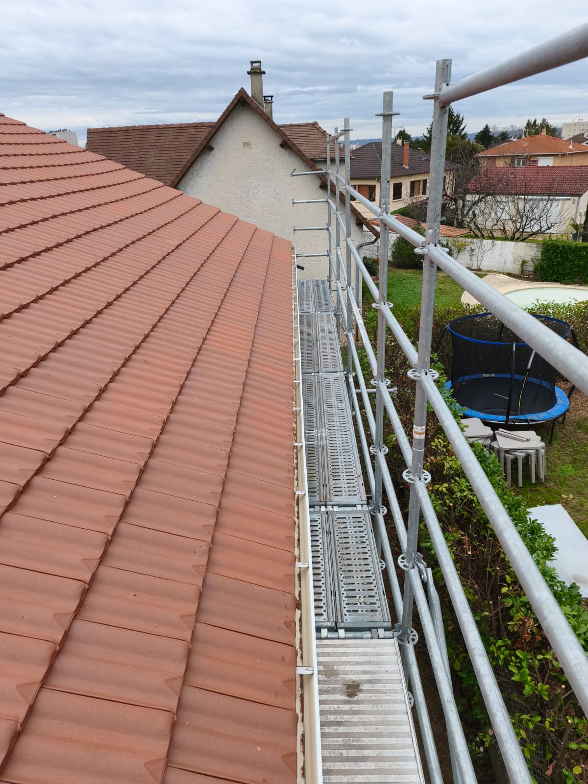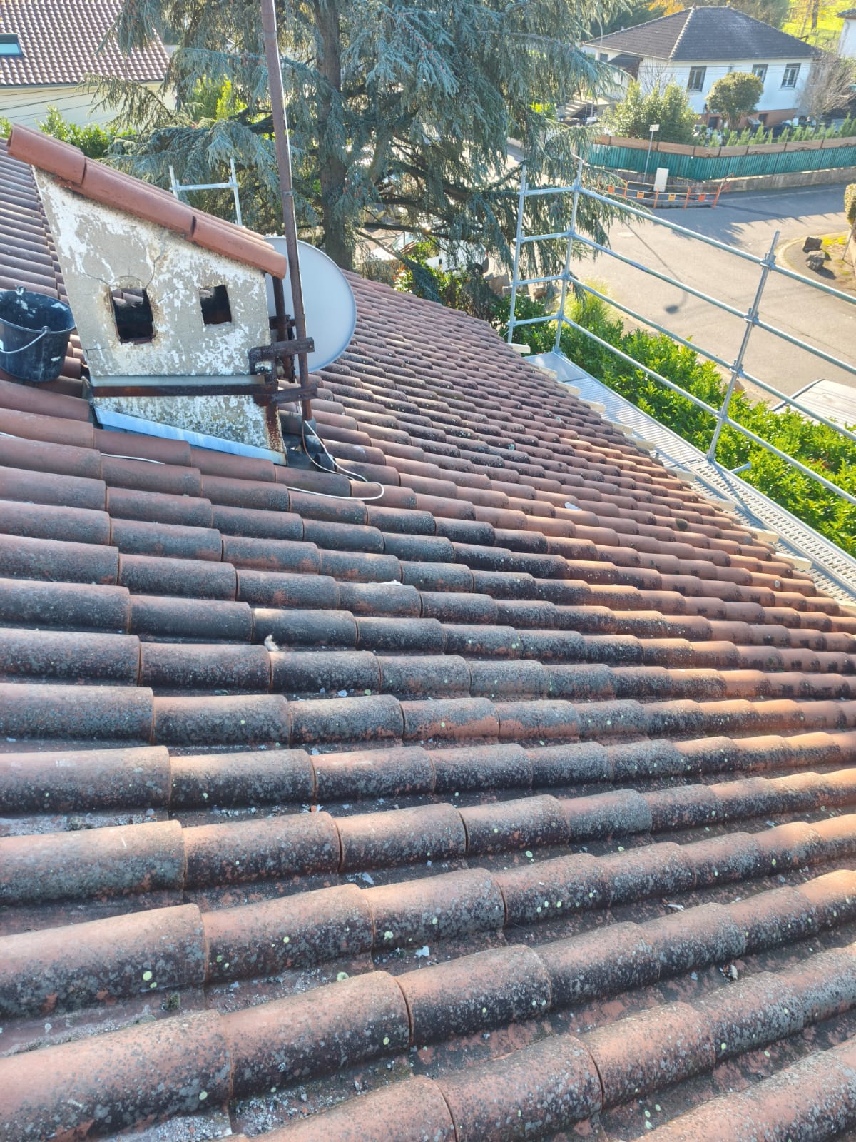 Avant toute intervention, nos équipes ont procédé à la mise en sécurité complète du chantier, avec l’installation d’échafaudages conformes aux normes en vigueur. L’ancienne couverture a ensuite été déposée intégralement afin de repartir sur une base saine.