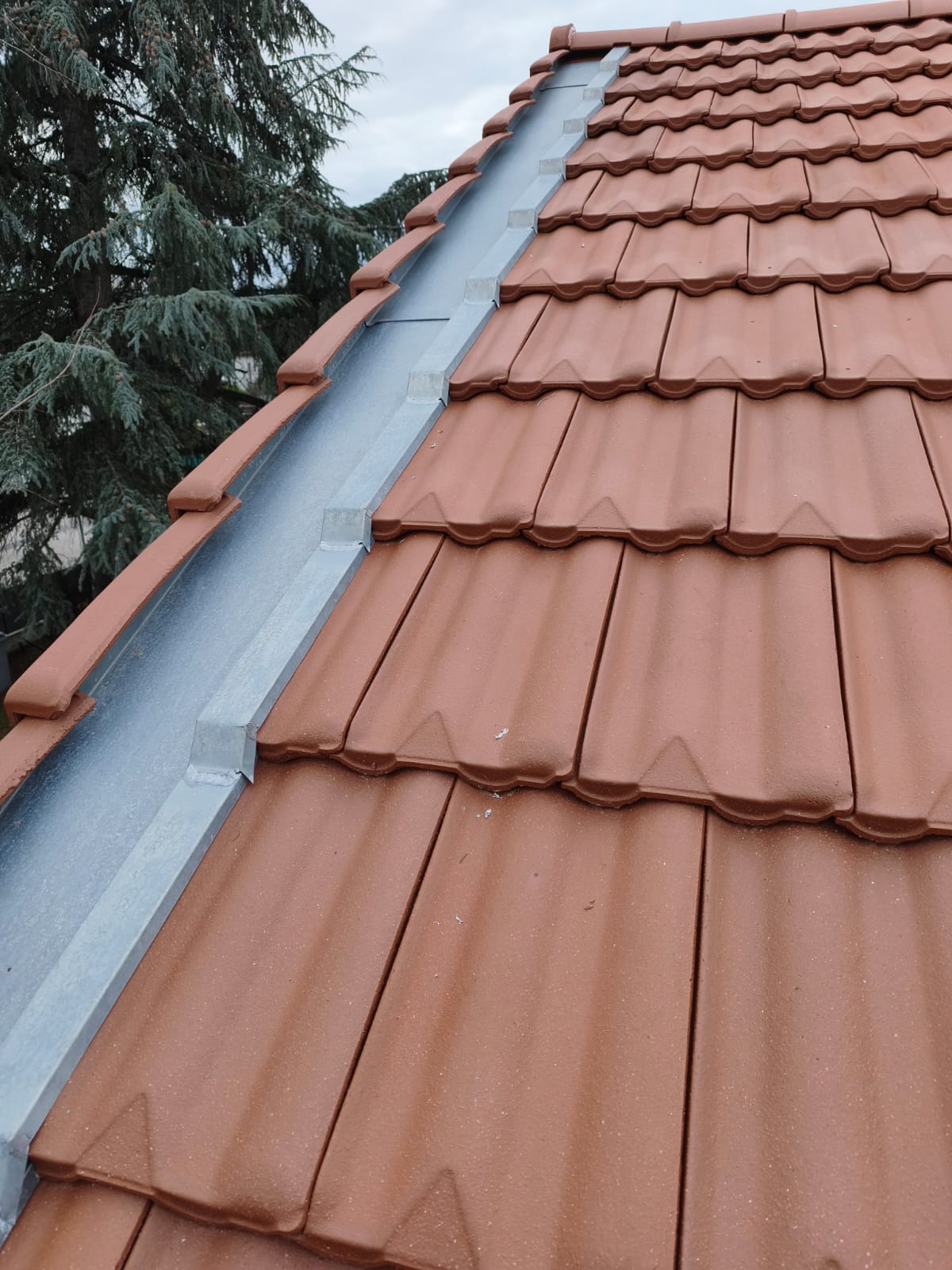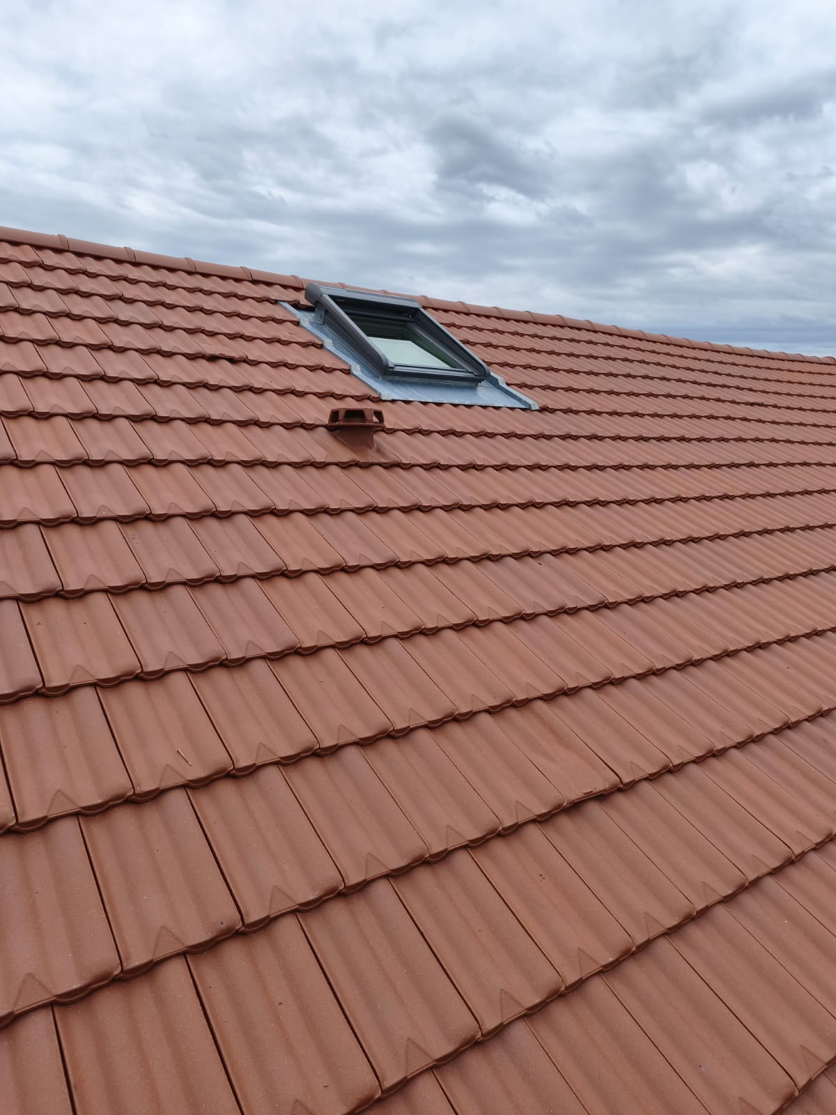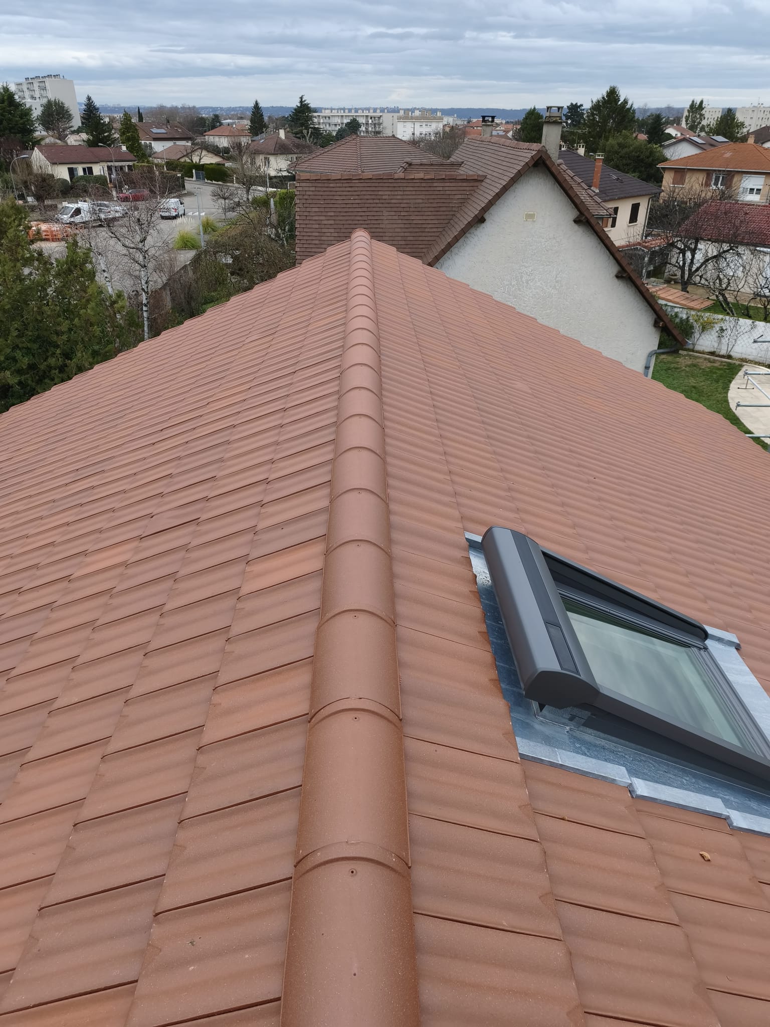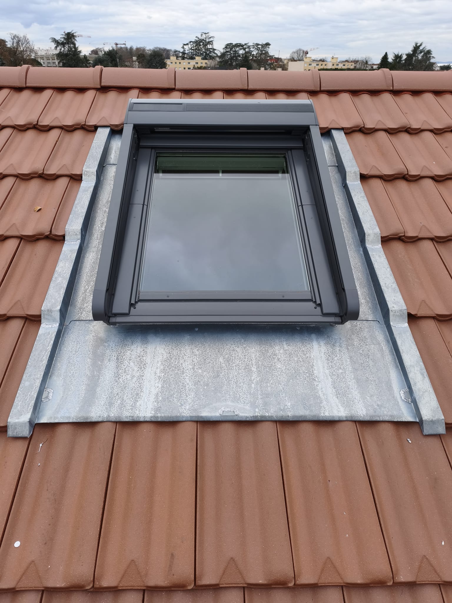 Ce projet comprenait la pose de tuiles Delta 10 rouges, la création d’un égout de toiture de 50 cm, ainsi que l’installation d’un Velux 78×98 équipé d’un volet roulant solaire.